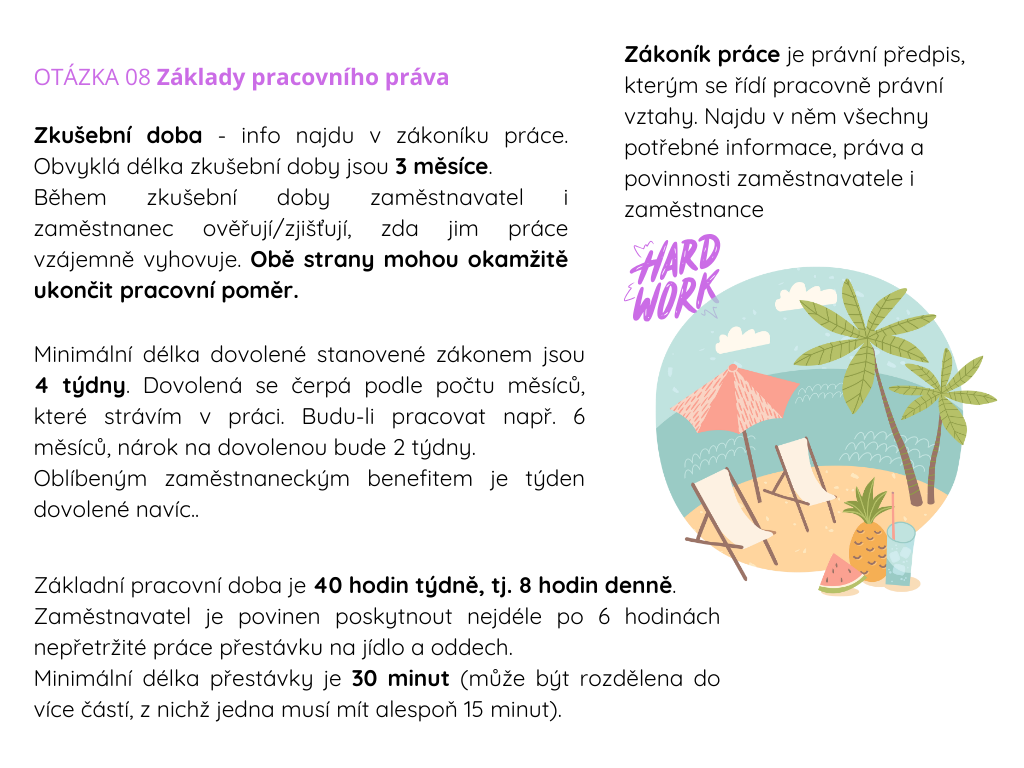 Vysvětli pojmy pracovního práva: zkušební doba, dovolená, pracovní doba, přestávky v práci.