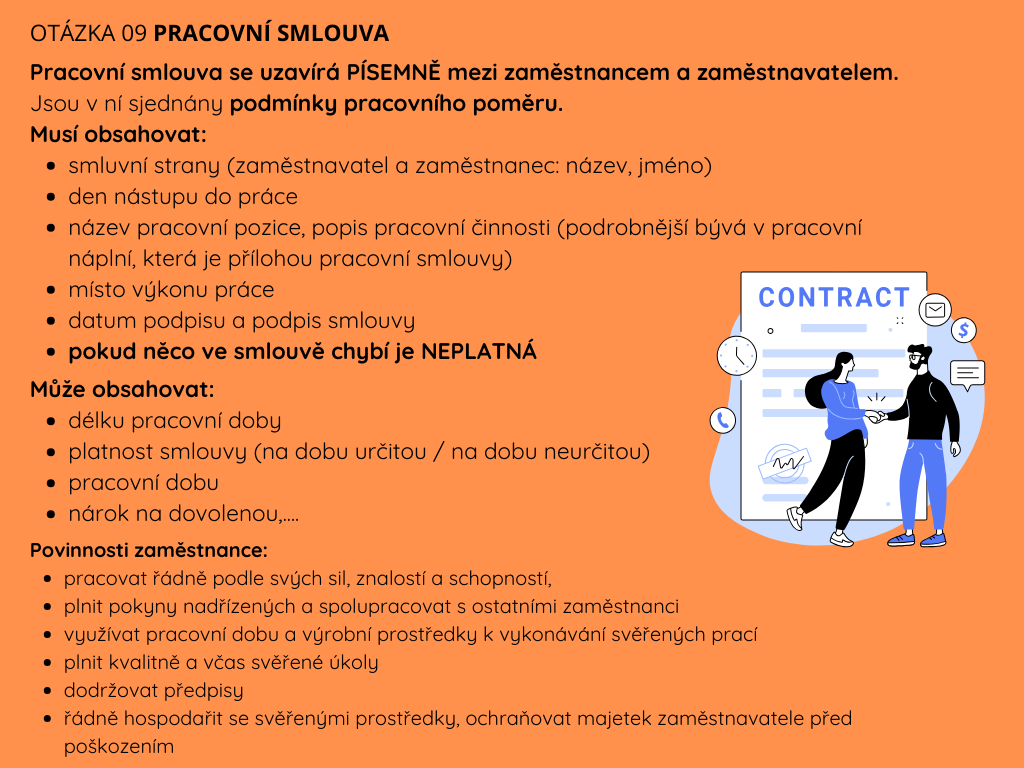 K čemu slouží pracovní smlouva, kdo ji uzavírá a jaké jsou její povinné náležitosti? Uveď příklady dalších ujednání, která by sis mohl/a sjednat v pracovní smlouvě?