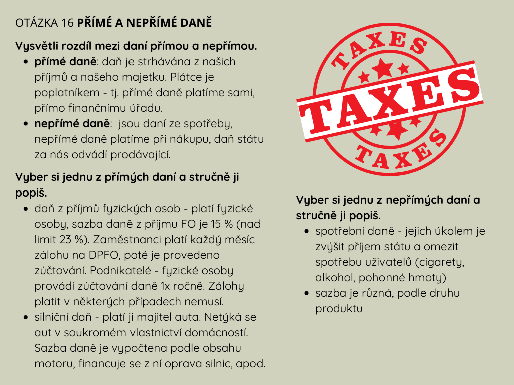 Jaký je rozdíl mezi daněmi přímými a nepřímými? Uveď příklady z obou skupin.