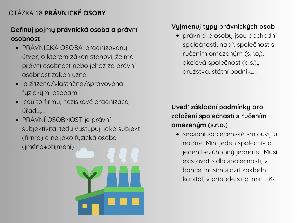 Co je právnická osoba? Jaké typy znáš? Uveď základní podmínky pro založení s.r.o.