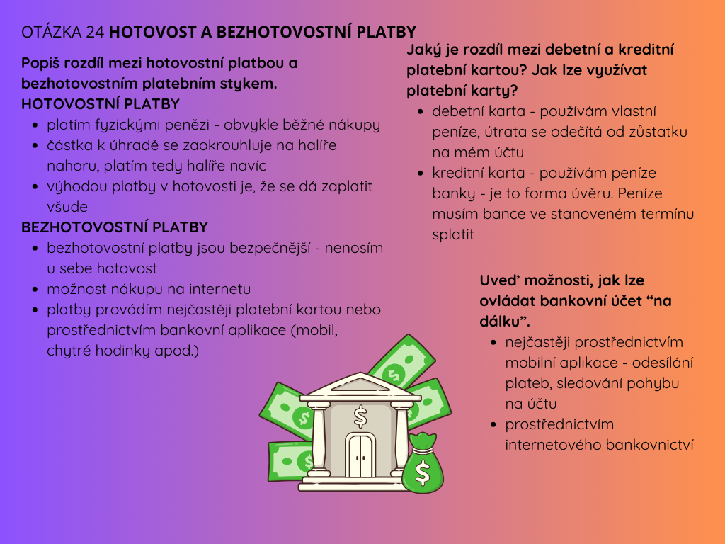 Vyjádři rozdíl mezi platbou v hotovosti a bezhotovostním platebním stykem. Vysvětli rozdíl mezi debetní a kreditní platební kartou; formy ovládání bankovního účtu na dálku.