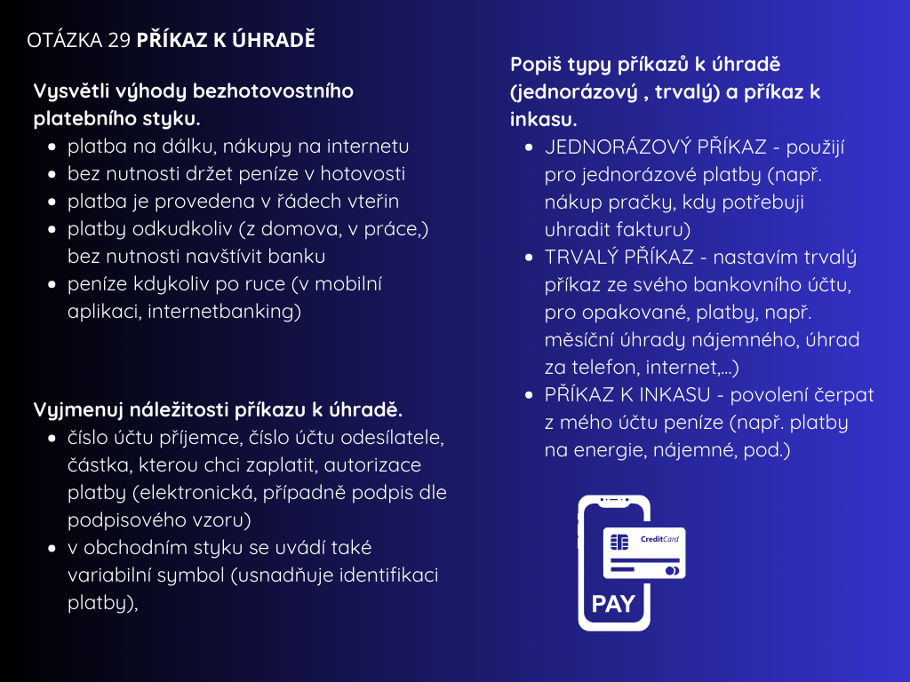 Popiš typy příkazů k úhradě (jednorázový, trvalý) a příkaz k inkasu.